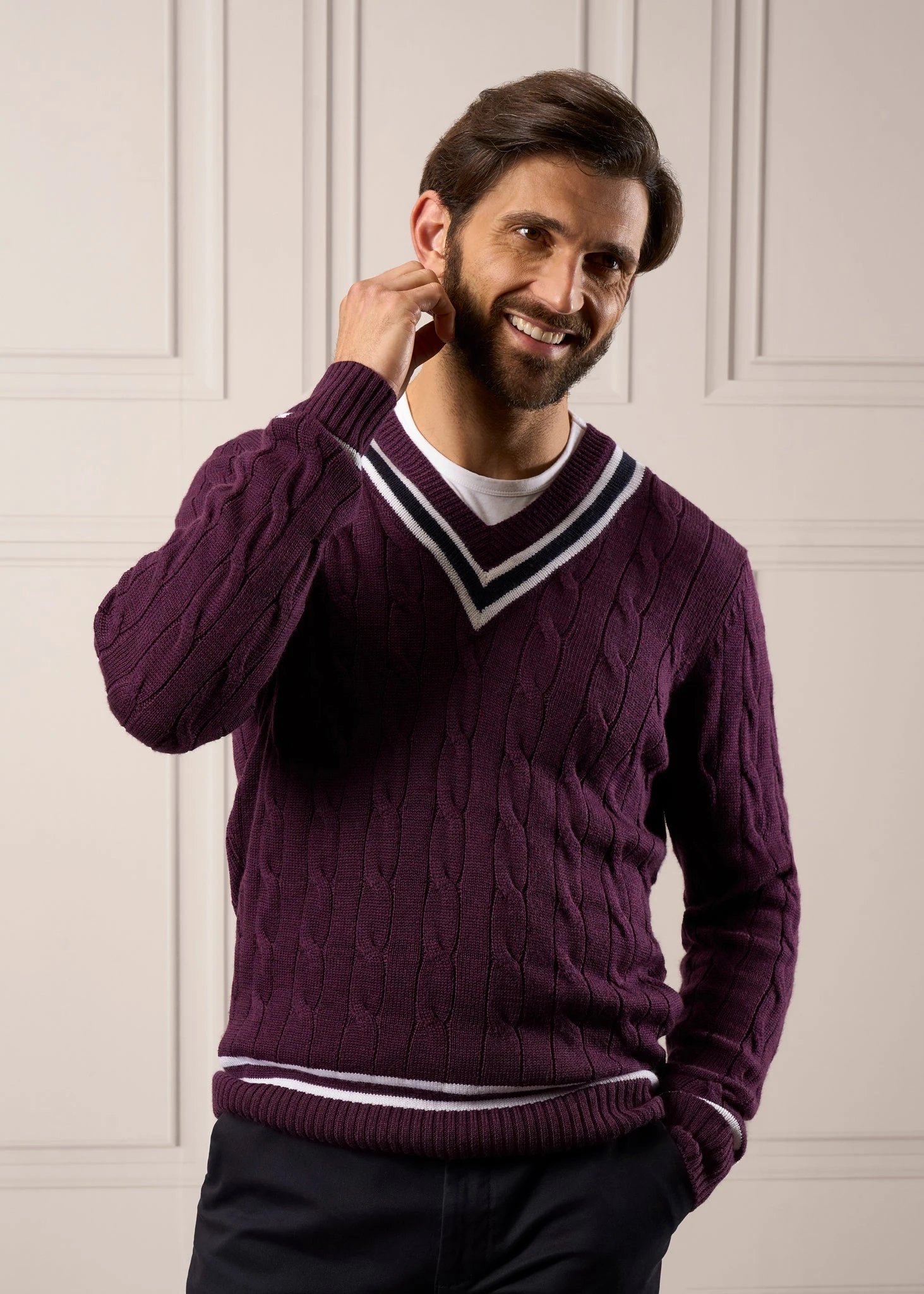 Knitted in fine merino wool, our Black Grape vee neck cricket jumper is a contemporary take on the traditional style. Featuring a sophisticated cable design, we’ve added a striking trim around the vee, cuffs and the welt.