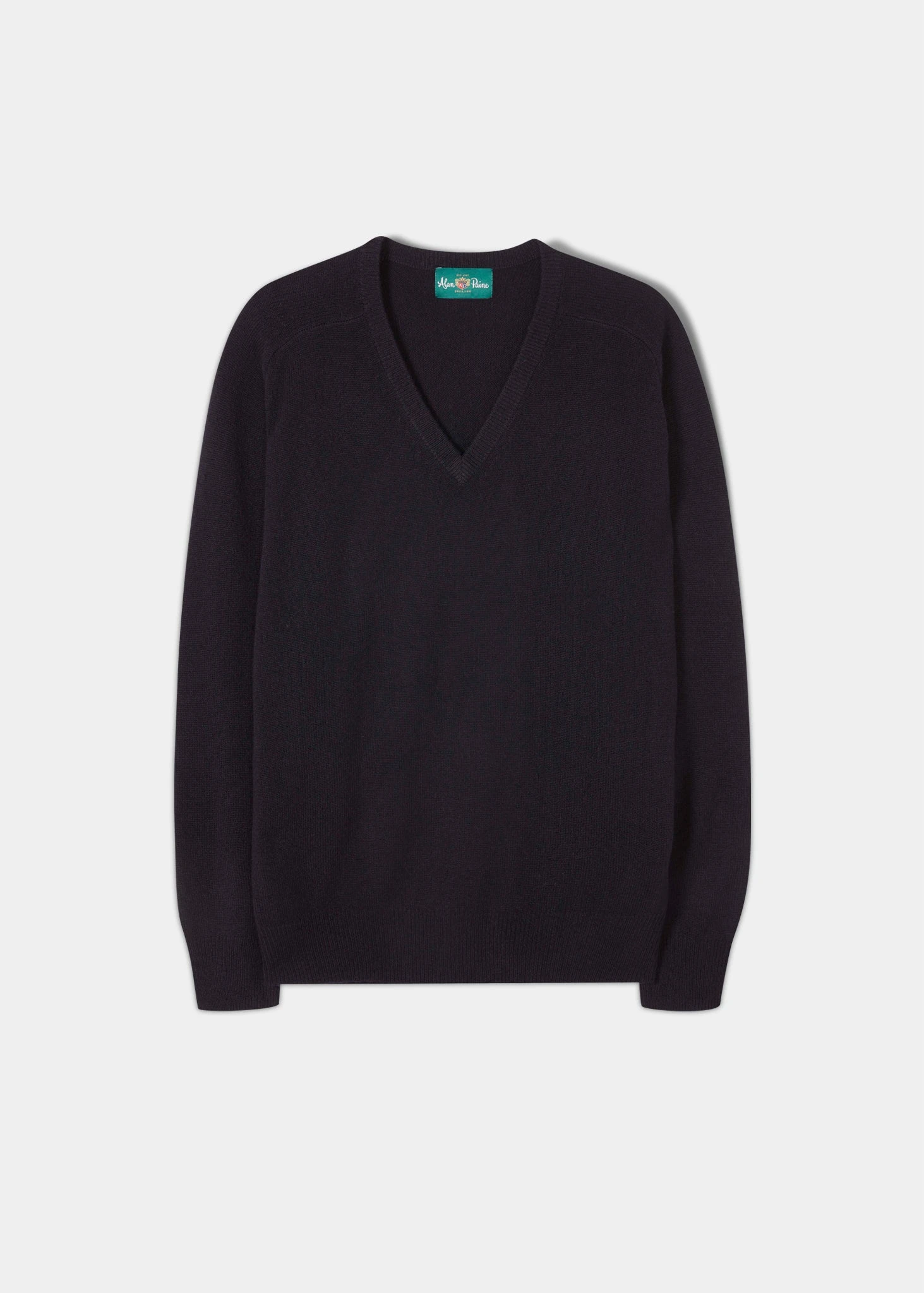A true classic. This V-neck jumper in Navy is crafted from pure super-soft lambswool and spun by Europe’s oldest spinner, Z. Hinchliffe, founded in Yorkshire, England 250 years ago. It has a full saddle shoulder shaping, generously cut across the waist, designed with a relaxed, more-traditional and comfortable fit.