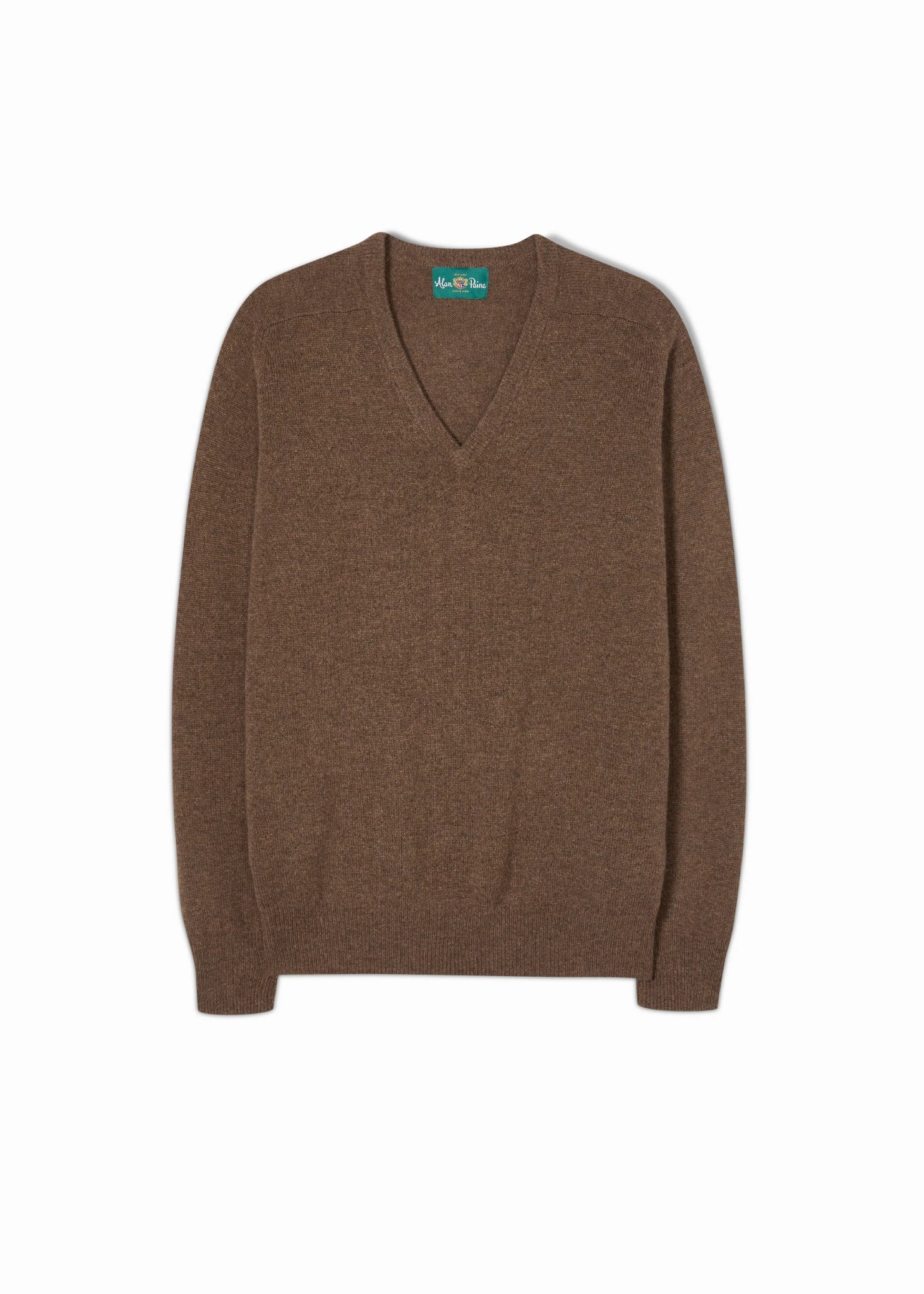 A true classic. This V-neck jumper in Tobacco is crafted from pure super-soft lambswool and spun by Europe’s oldest spinner, Z. Hinchliffe, founded in Yorkshire, England 250 years ago. It has a full saddle shoulder shaping, generously cut across the waist, designed with a relaxed, more-traditional and comfortable fit.