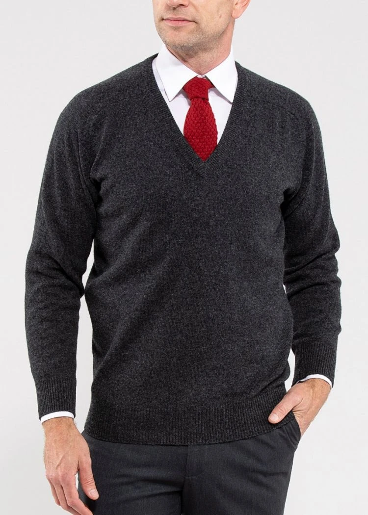 A true classic. This V-neck jumper in Charcoal is crafted from pure super-soft lambswool and spun by Europe’s oldest spinner, Z. Hinchliffe, founded in Yorkshire, England 250 years ago. It has a full saddle shoulder shaping, generously cut across the waist, designed with a relaxed, more-traditional and comfortable fit.