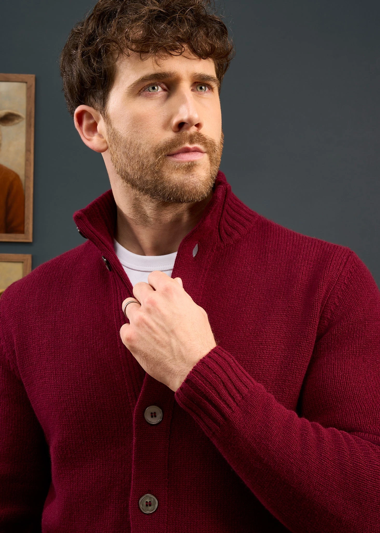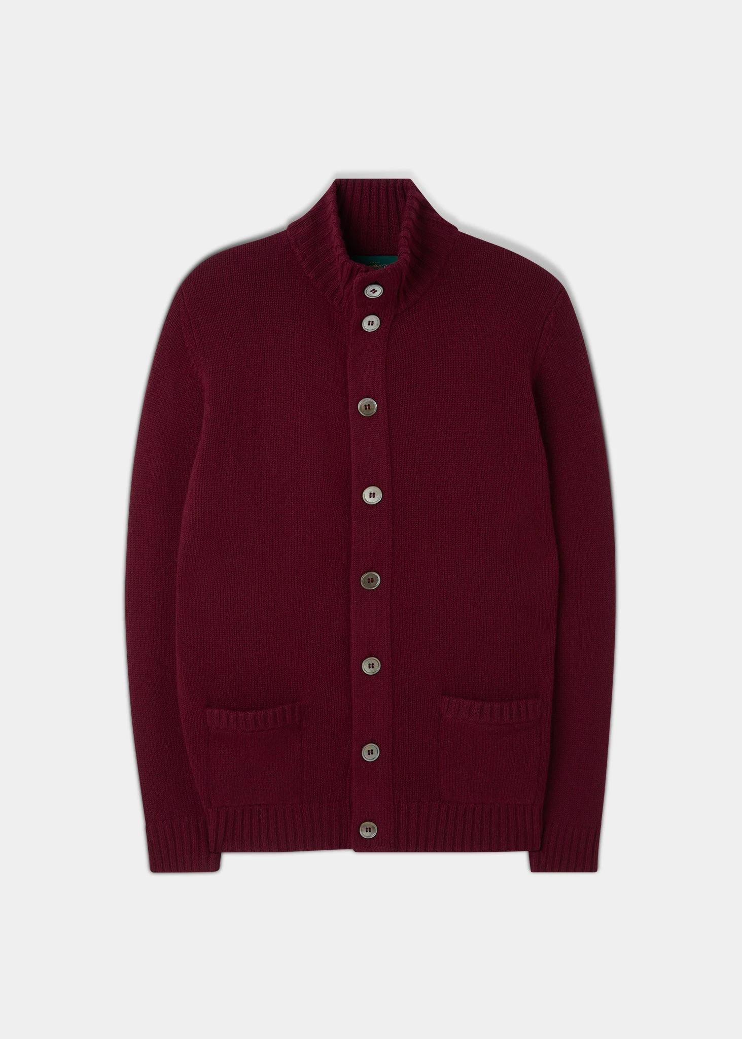 Effortlessly versatile, this timeless pure Lambswool mock neck cardigan In Bordeaux will work over a shirt or plain tee. A ribbed stand-up collar, cuffs, hem plus ribbed detail on the pockets give this classic a contemporary twist.