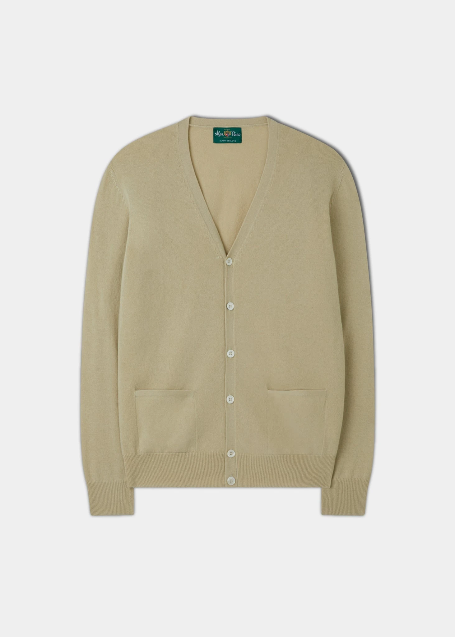 Our classic traditional fitting vee cardigan in Natural is a timeless classic and the perfect addition to any man’s wardrobe. This garment features traditional cardigan summarys, two jetted pockets and crafted from pure super-soft geelong lambswool and spun by Europe’s oldest spinner, Z. Hinchliffe, founded in Yorkshire, England 250 years ago. It has a full saddle shoulder shaping, generously cut across the waist, designed with a relaxed, more-traditional and comfortable fit.